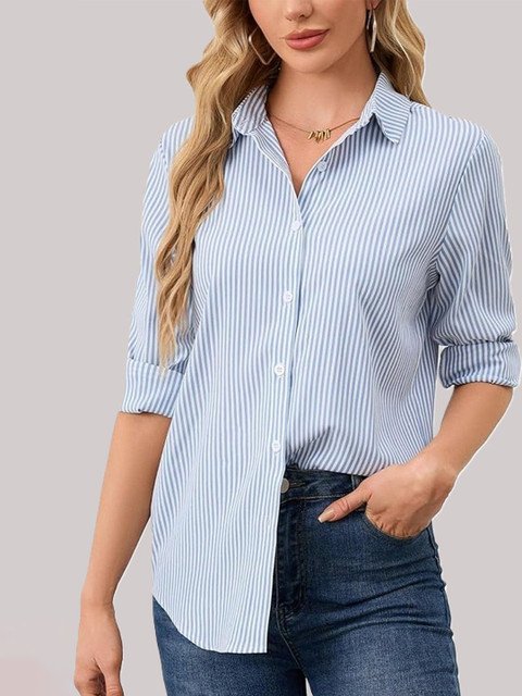 Blue & white vertical striped opaque casual shirt ,has a spread collar, button placket, no pocket, long regular sleeves, curved hem