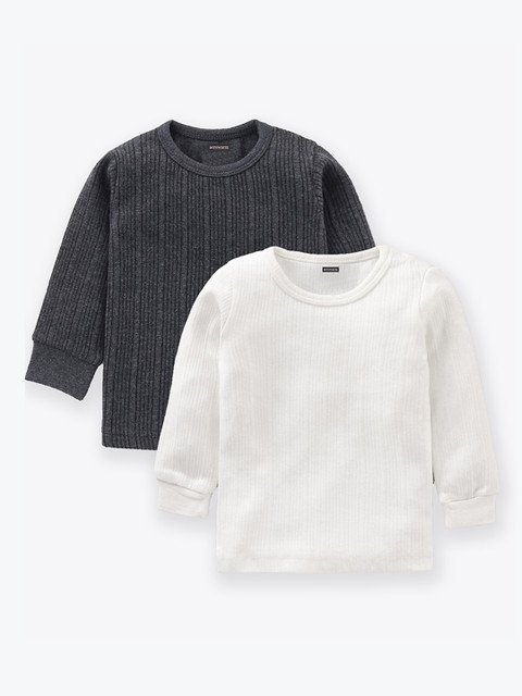 Pack of 2 striped thermal tops in white & charcoal colored, each has a round neck, and has long sleeves with straight hem