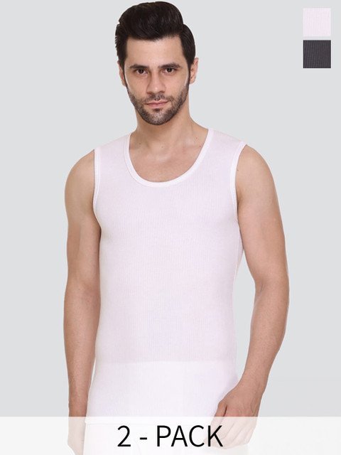 Pack of 2 ribbed thermal tops in charcoal charcoal and white, each has a round neck and sleeveless