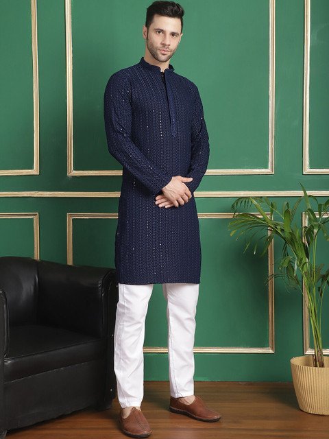 Anouk Navy Blue Geometric Embroidered Sequinned Kurta with Pyjamas