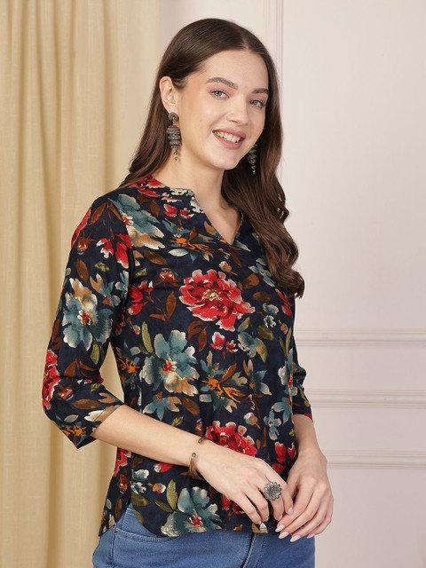 Anouk Rustic Floral Print Mandarin Collar Shirt Style Top