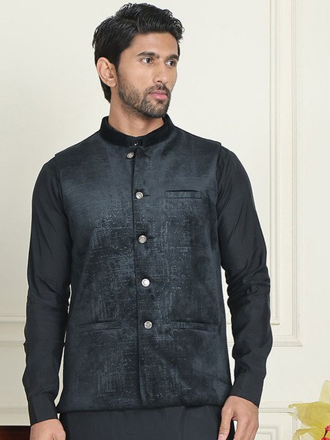Black solid woven nehru jacket, has a mandarin collar, a full button placket, sleeveless, three pockets