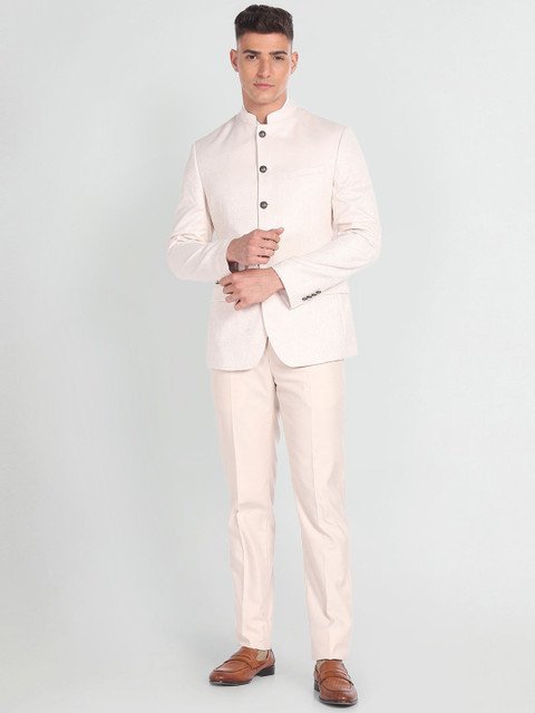 Beige solid regular-fit bandhgala blazer, has a notched lapel, single-breasted with double button closures, long sleeves, one welt pocket, and two flap pockets, and a ventless back hem