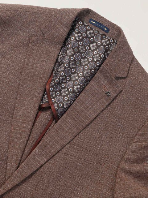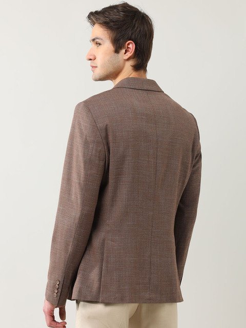 Brown textured formal blazer, has a notched lapel, long sleeves, single-breasted with double button closure, two flap pockets, one welt pocket and a double-vented back hem