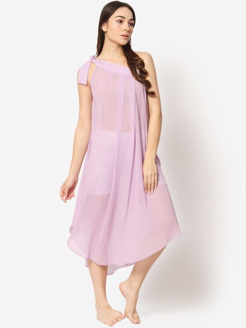 Pink sold cover up dress has one shoulder neck with knot, midi length,sleeveless, pleated detail, flared curved hem
