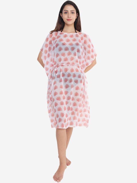 White and peach-coloured printed kaftan swimwear cover up kaftan dress. with round neck and kimono sleeves. The Georgette material makes sure that you stay in comfort all day long throughout the wear.