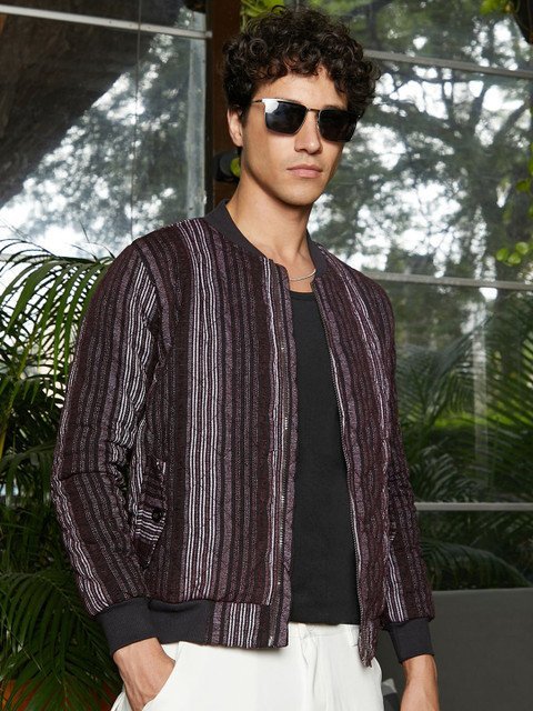Campus Sutra Men Stand Collar Striped Cotton Casual Biker Jacket