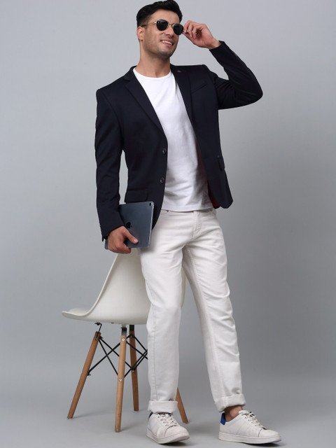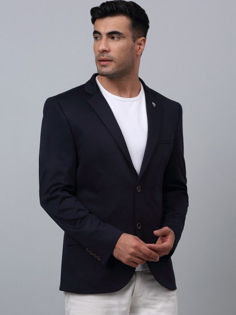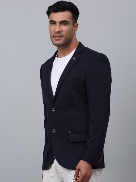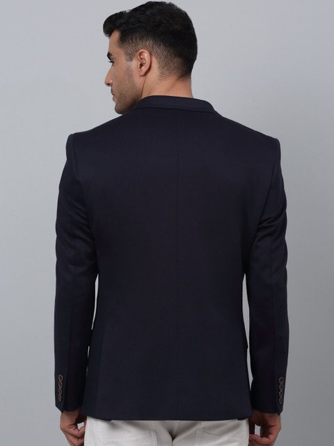Navy Blue solid regular-fit formal blazer, has a notched lapel, single-breasted with a double-button closure, long sleeves, two flap pockets, one welt pocket, and an attached lining