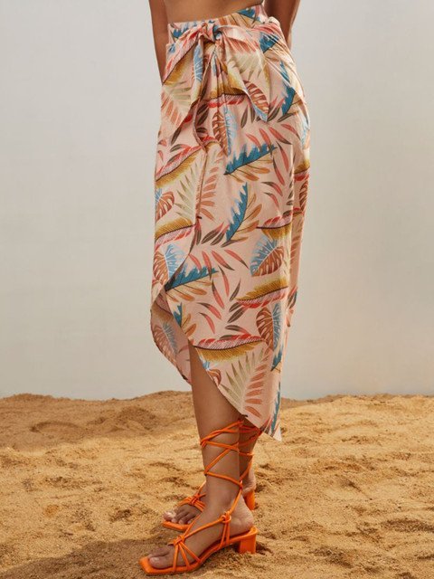 Beige and blue tropical printed ready to wear sarong, secured with a hook and zip closure