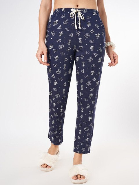 Navy blue & White printed lounge pants, has an elasticated waistband with drawstring closure & one pockets