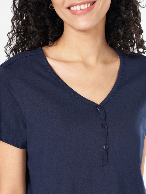 Navy Blue solid lounge t-shirt, has a v-neck and short sleeves with slip-on closure