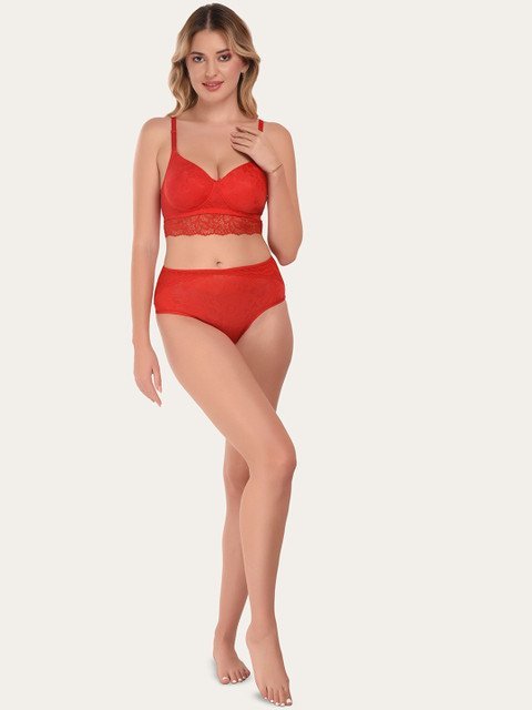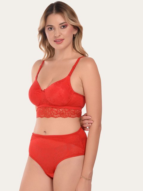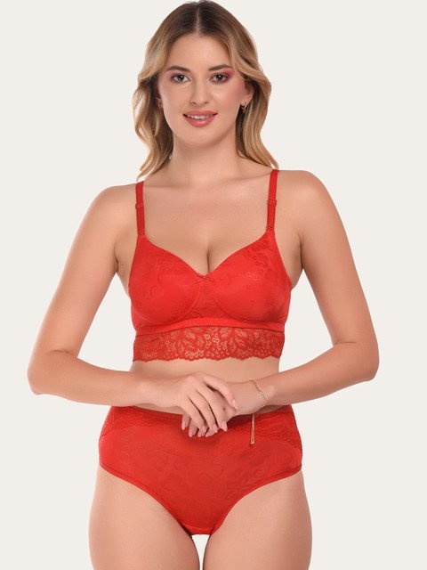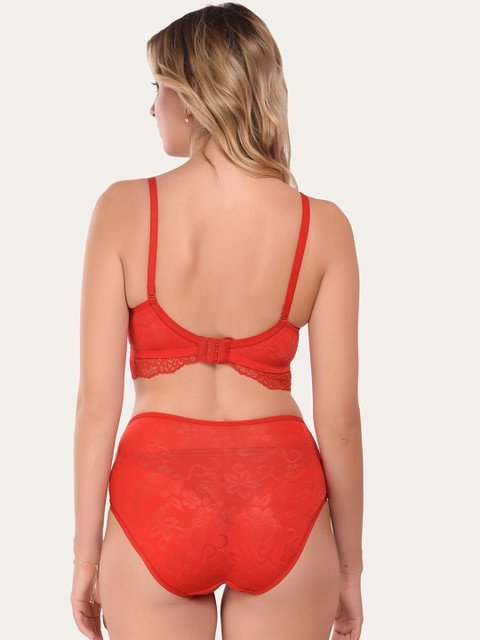 red self design lingerie set full-coverage bra, has lightly-padded and non-wired seamless cups, adjustable shoulder straps, and hook and eye closure at the back