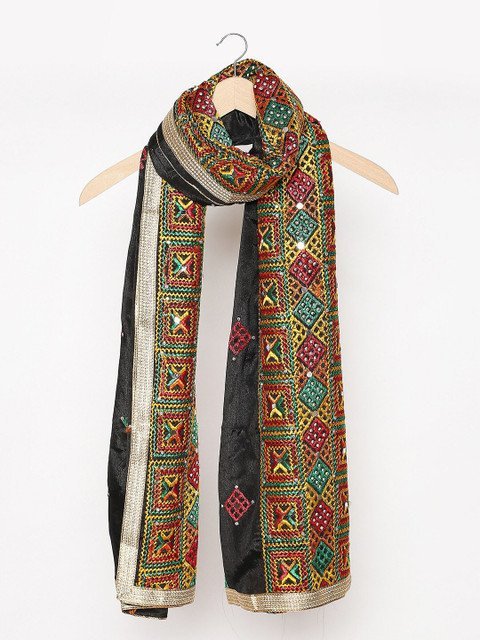 Black and gold-coloured ethnic motifs embroidered dupatta, has phulkari, embellished border