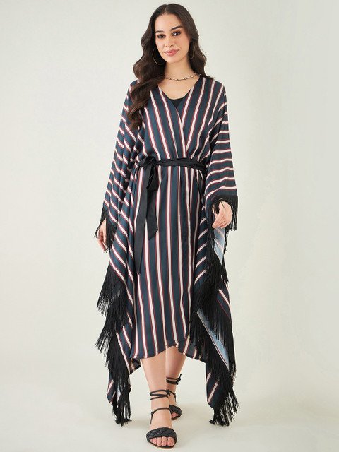 Stylish dark blue striped satin beach cover-up finished with black fringe along with matching satin waist belt.