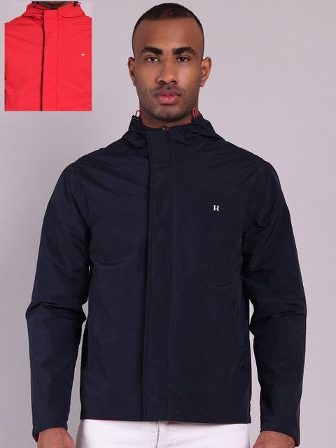 Red and Black Color Blocked regular-fit hooded rain jacket, has zip closure with front flap, long sleeves, straight hem, and two pockets ,Attached hood with draw cord