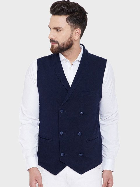 Blue solid slim-fit woven waistcoat, has a lapel collar, sleeveless, a full buttoned placket, one pockets