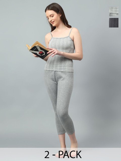 Grey milange & charcoal-grey self design thermal set consists of a 2 camisole and 2 capris
