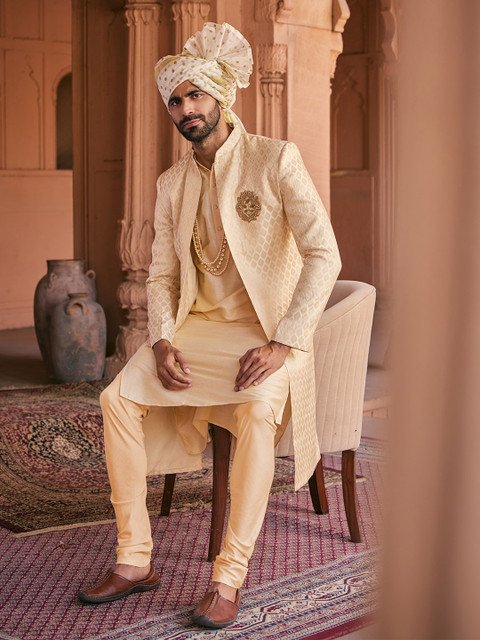 KISAH Men Self-Design Mandarin Collar Indowestern Sherwani Set