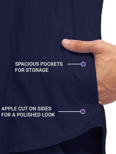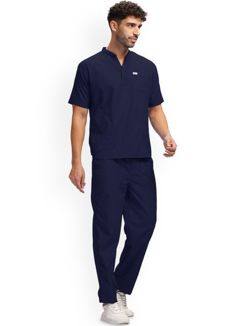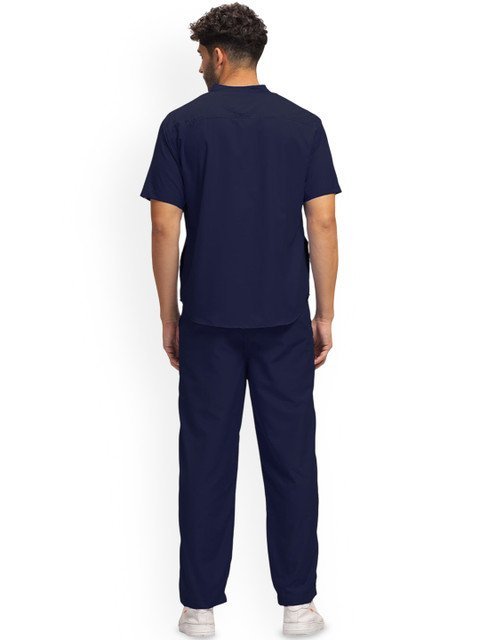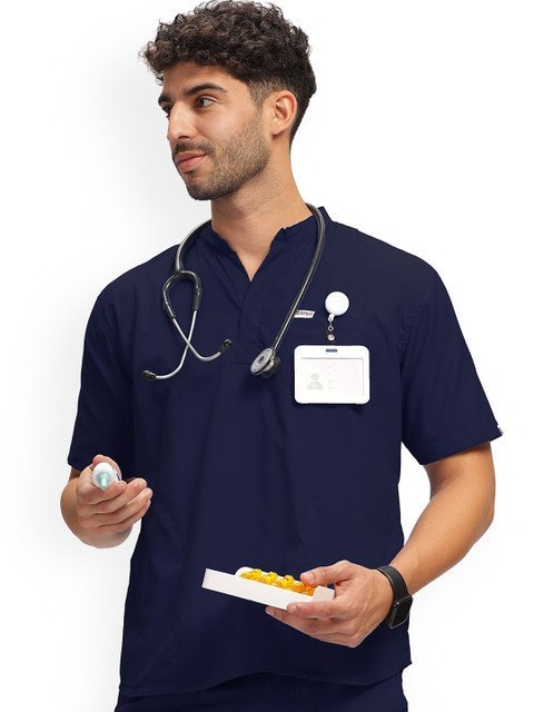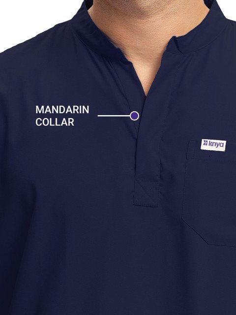 Navy blue solid tshirt, has a mandarin collar-neck and short sleeves, Secured with button closure