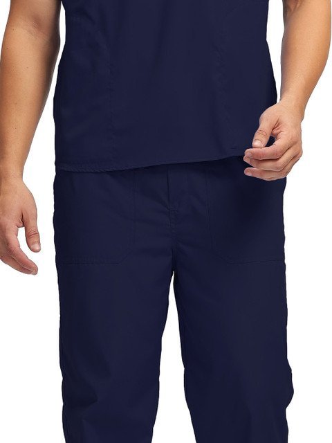 Navy blue solid trouser, has an elasticated waistband with drawstring closure and 5 pockets