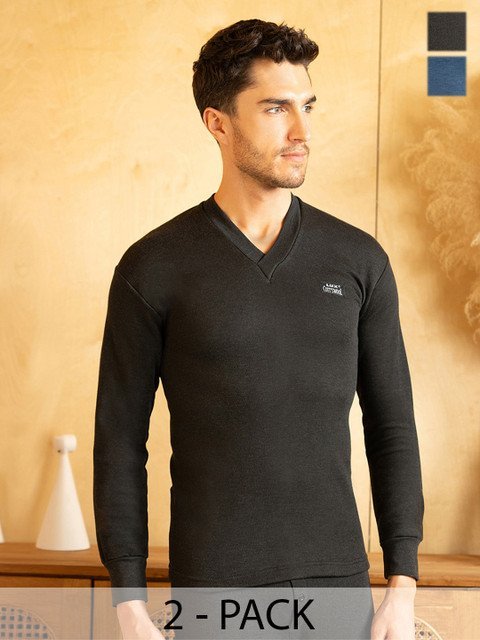 Lux Cottswool Men Pack Of 2 Black & Blue Solid Thermal Tops