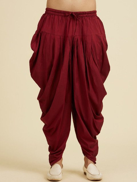 Maroon solid mid-rise Patiala with gathers and pleats has an elasticated waistband with a drawstring fastening