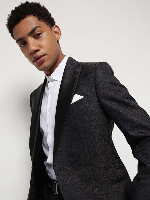 Black textured slim-fit formal blazer, has a notched lapel, long sleeves, single-breasted with double button closure, two flap pockets, one welt pocket and a double-vented back hem