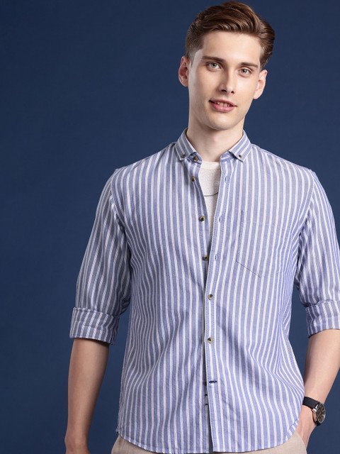Blue vertical stripes striped opaque Casual shirt ,has a button-down collar, button placket, 1 patch pocket, long regular sleeves, curved hem