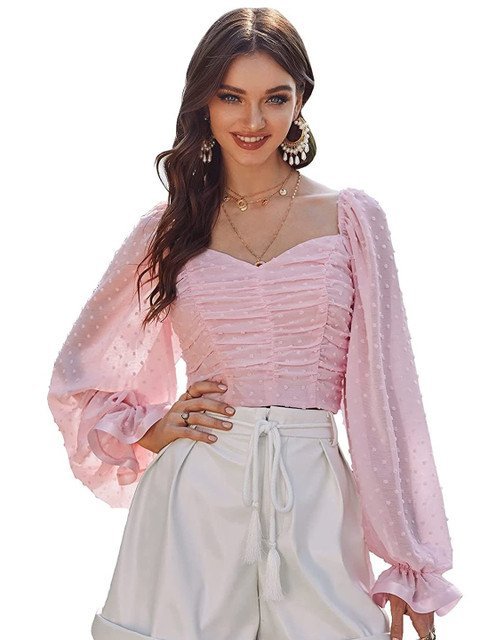 MIZAGO Women Georgette Sweetheart Neck Bishop Sleeves Ruched Crop Fitted Top