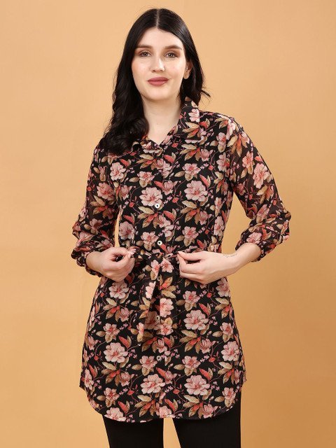 Floral Red printed tunic ,has a shirt collar, three-quarter sleeves, button closure