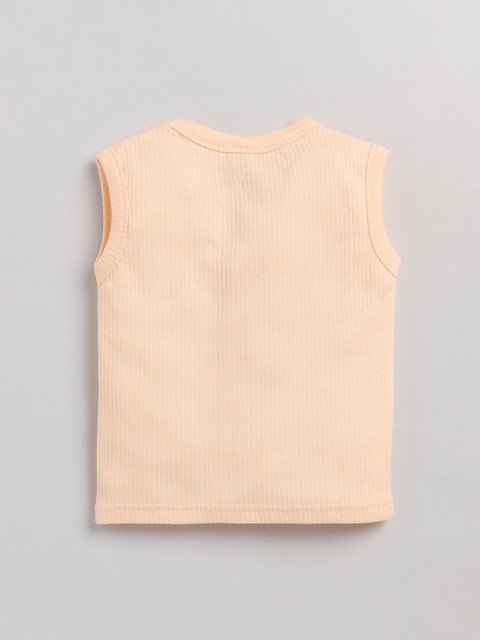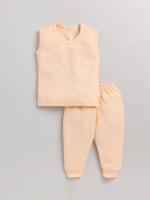 Peach Colored striped thermal set has a round neck, and sleeveless
