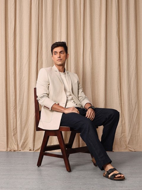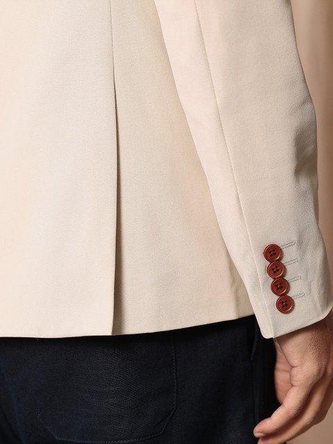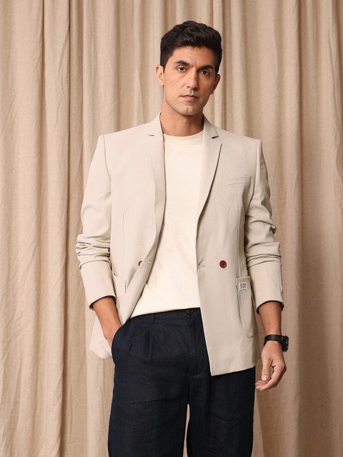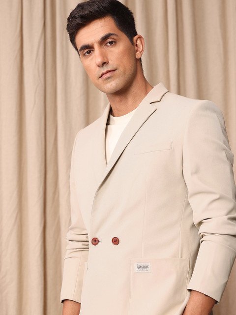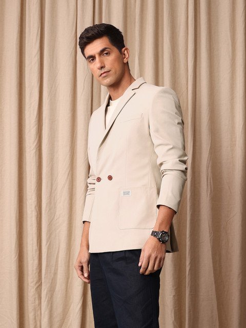 Grey solid double-breasted casual blazer, has a notched lapel collar, long sleeves, button closure, 3 pockets, double vented back hem & polyester lining.