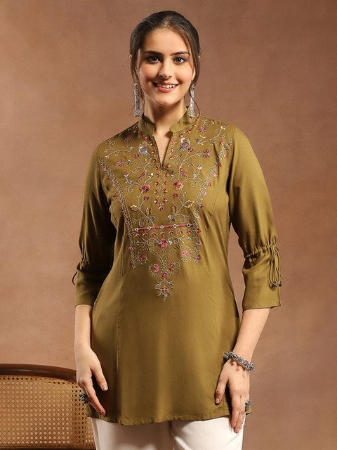 Nayam By Lakshita Olive Green Viscose Rayon Mandarin Collar Embroidered Tunic