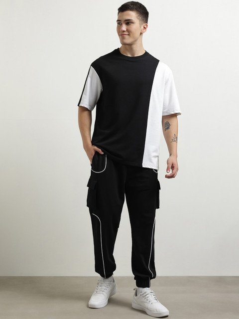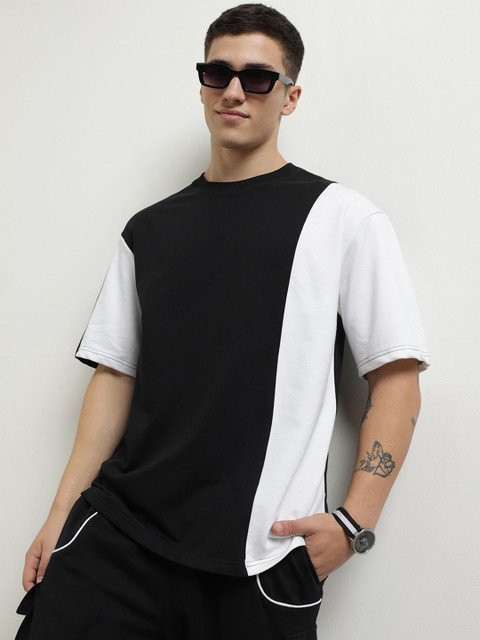 Black and white colourblocked regular-fit t-shirt has a round neck and short sleeves