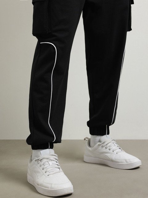 Black solid mid-rise joggers has an elasticated waistband with drawstring closure, cuffed hems and 4 pockets