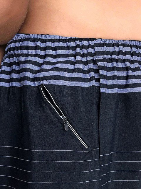 Black & blue striped lungi, has elasticated waistband with drawstring closure and one zip pocket