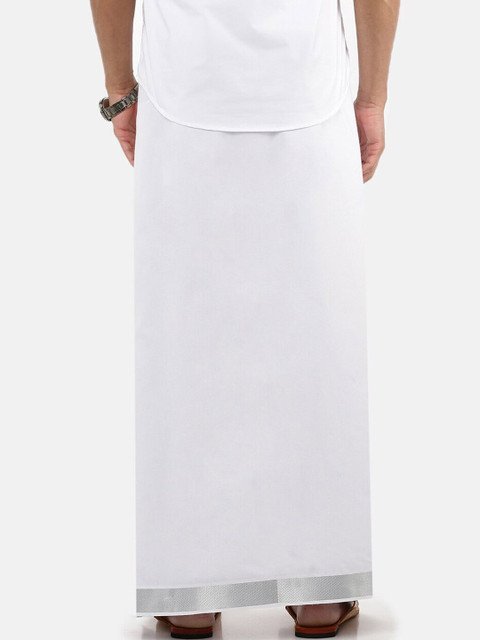 White solid veshti with silver-toned zari border ,Cotton, Slipon Dhoti