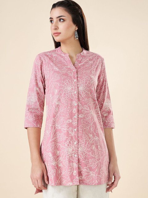 Pink and white printed tunic ,has a mandarin collar, three-quarter sleeves, button closure