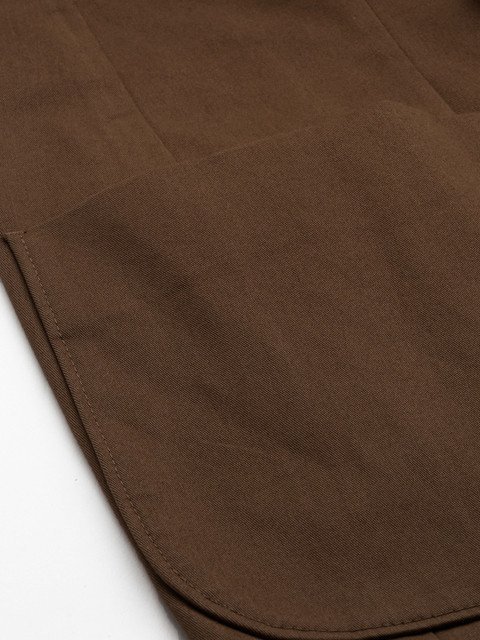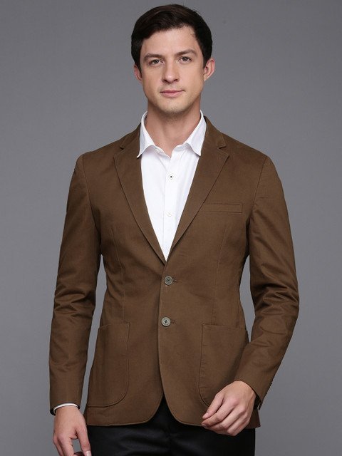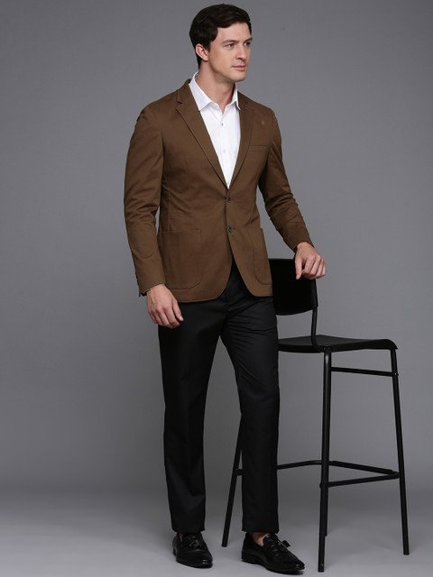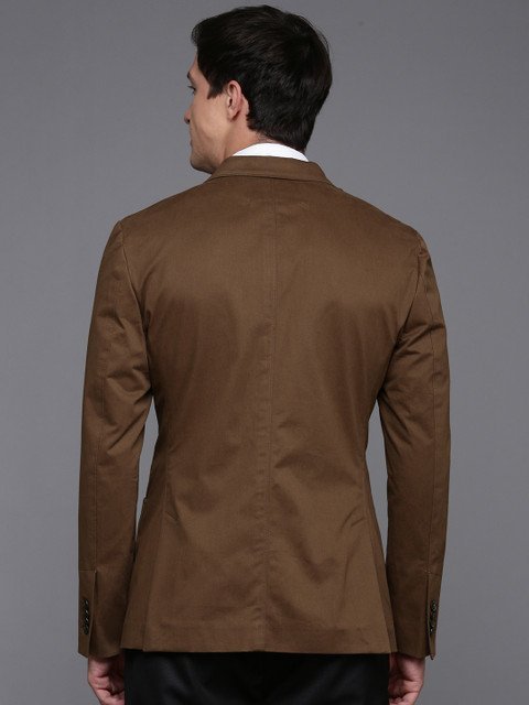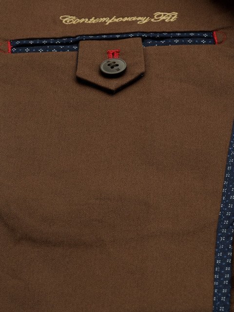 Brown solid contemporary-fit formal blazer, has a notched lapel collar, long sleeves, single-breasted with button closures, three pockets with one in-built pocket, and a double vented back hem