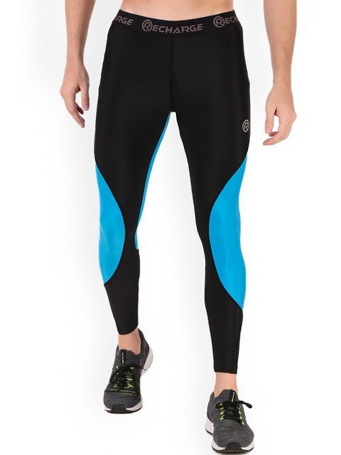 Black and blue colourblocked mid-rise ankle-length tights, an elasticated waistband, and slip-on closure