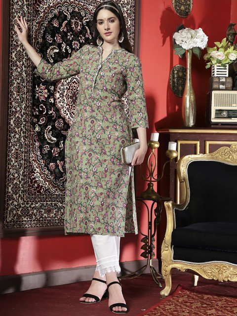 Sangria Floral Printed Mandarin Collar Cotton Straight Kurta