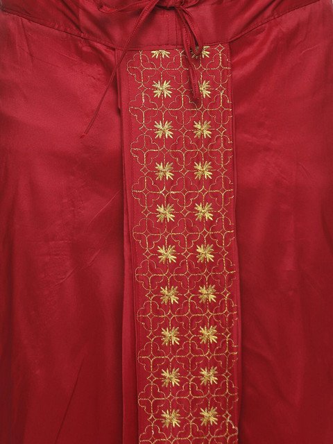Maroon embroidered regular-fit dhoti pant with pleats and gathers features waistband with drawstring closure.