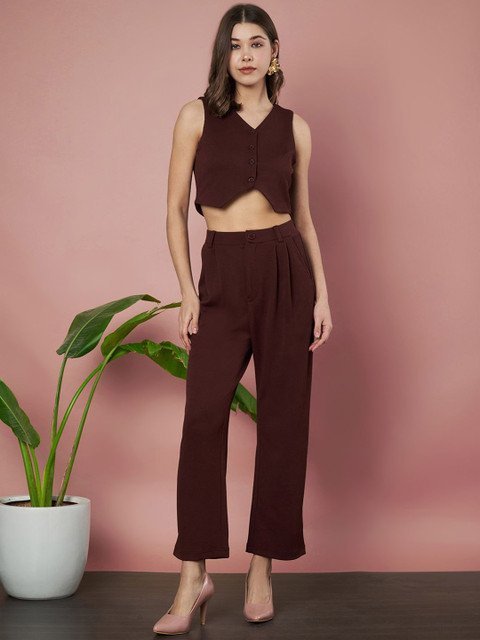 Coffee Brown ribbed waistcoat, has a v-neck , a full button placket, sleeveless