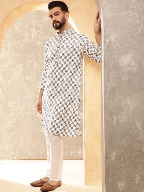 SOJANYA Floral Embroidered Mandarin Collar Thread Work Straight Kurta With Pyjamas
