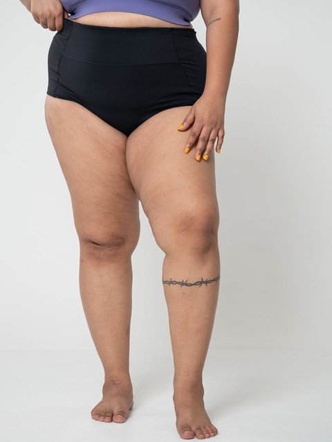 Black solid high-waist swim bottoms, has an elasticated waistband