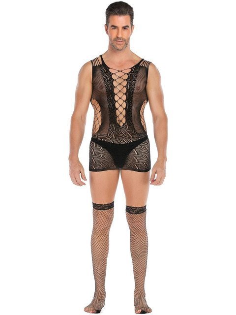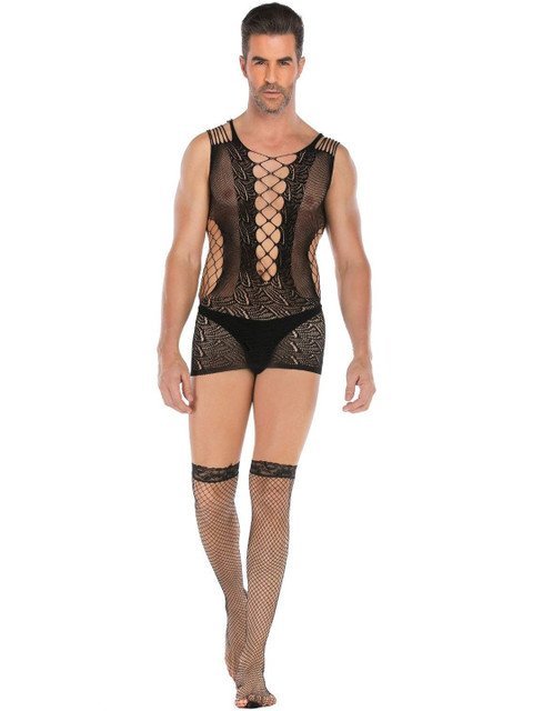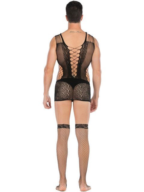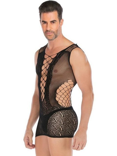 Men Black Polyester Fishnet Bodysuit