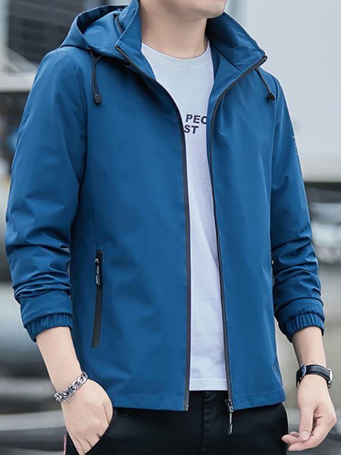 Blue solid tailored jacket, has a hooded, 2 pockets ,has a zip closure, long sleeves, straight hemline, mesh lining