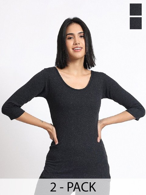 Pack of 2 Black solid ribbed thermal top, has a round neck, and has three-quarter Sleeves with straight hem