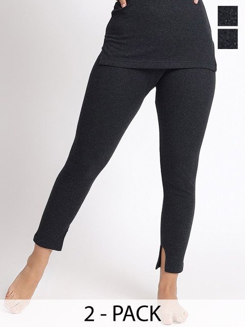 Pack of 2 Black solid ribbed mid-rise thermal bottom, has an elasticated waistband with slip-on closure