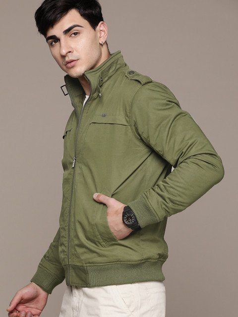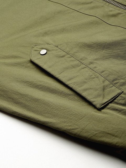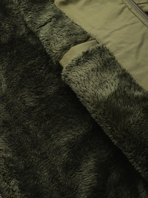 Olive green solid padded jacket with shoulder tabs, has a mock collar, 2 pockets, a zip closure, long sleeves, straight hemline, and faux fur lining